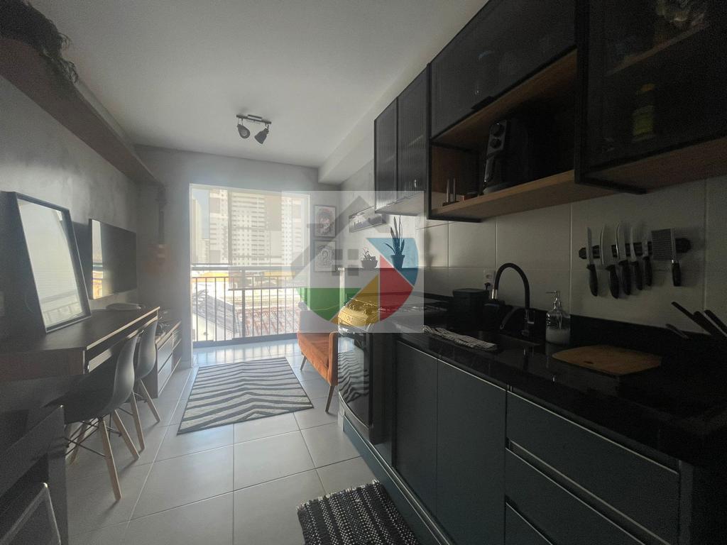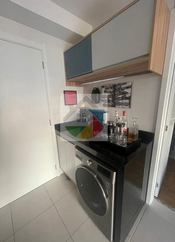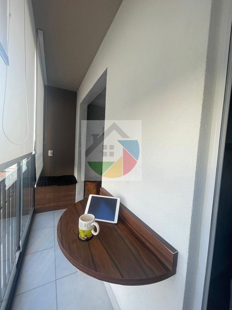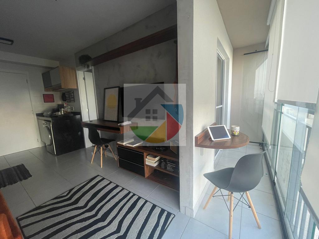 Lindo apartamento mobiliado no bairro Água Branca, 31 metros quadrados, 1dormitório com armários planejados, cama de casal, piso laminado e varanda, sala com sofá, rack, mesa de apoio com 2 cadeiras, prateleira suspensa e varanda, cozinha com armários planejados, fogão e geladeira duplex, área de serviço integrada com a cozinha, máquina lava e seca, armário, tanque de lavar roupas embutido, interfone, varanda com mesa de apoio, puff e cortina de rolo.
