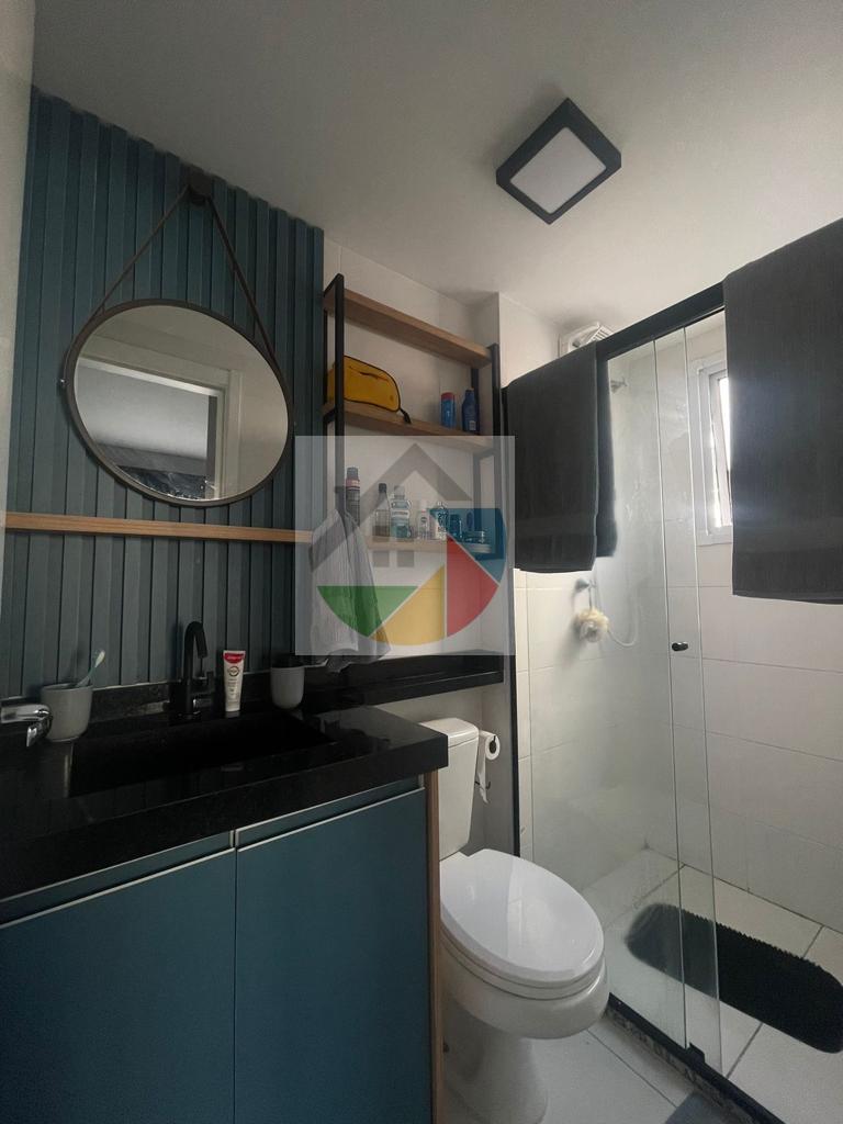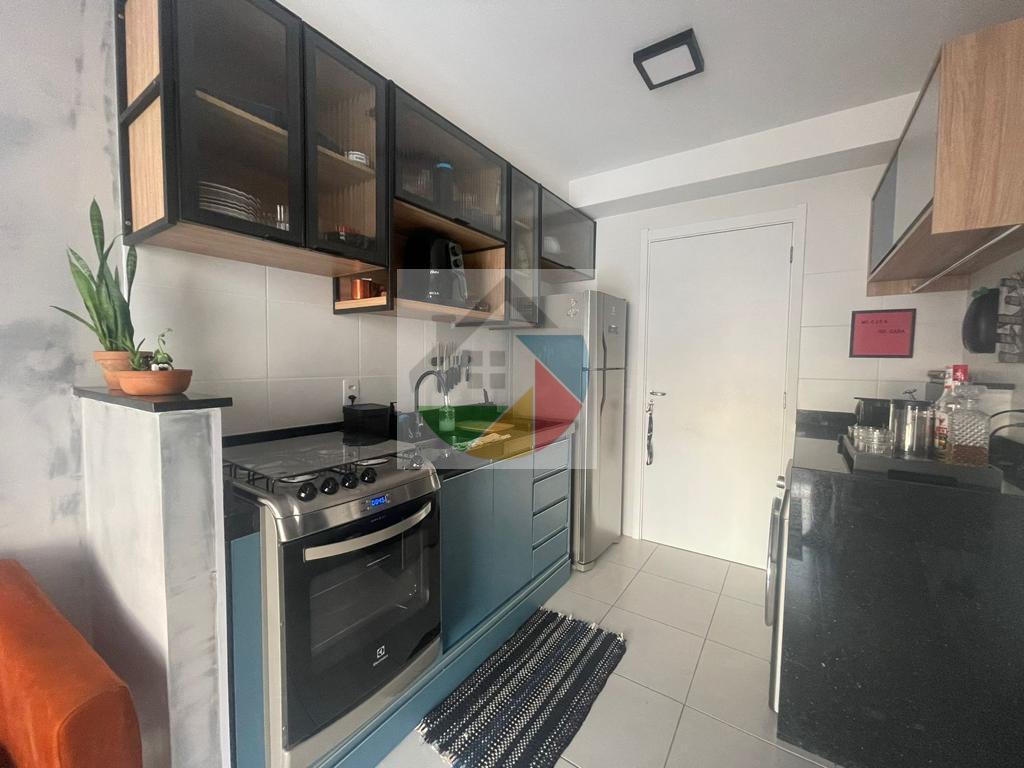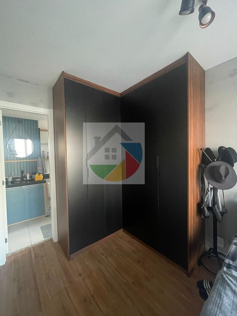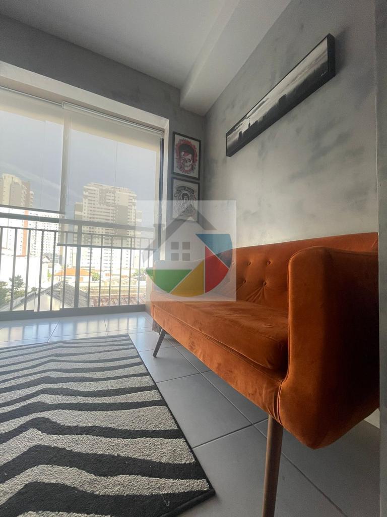 Lindo apartamento mobiliado no bairro Água Branca, 31 metros quadrados, 1dormitório com armários planejados, cama de casal, piso laminado e varanda, sala com sofá, rack, mesa de apoio com 2 cadeiras, prateleira suspensa e varanda, cozinha com armários planejados, fogão e geladeira duplex, área de serviço integrada com a cozinha, máquina lava e seca, armário, tanque de lavar roupas embutido, interfone, varanda com mesa de apoio, puff e cortina de rolo.